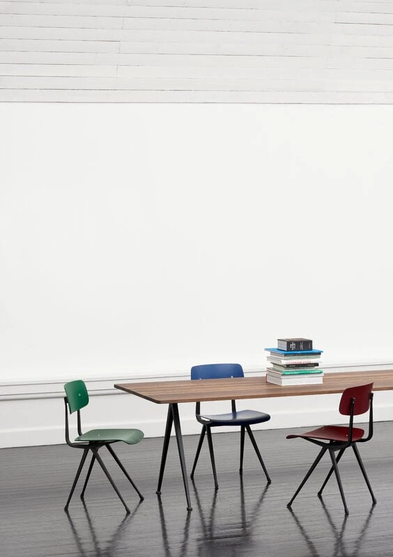 La chaise Result, conçue par Friso Kramer et Wim Rietveld pour Ahrend dans les années 1950, a été relancée par HAY en collaboration avec Ahrend. Result est la combinaison simpliste d’une structure épurée en acier et d’une assise et d’un dossier en contreplaqué incurvés. Elle était considéré dans les années 50 comme un chef-d’œuvre de l’utilisation innovante de la tôle d’acier et elle a conservé son apparence fraîche jusqu’à aujourd’hui. Grâce à son design léger et fonctionnaliste, Result était une chaise populaire dans les écoles scandinaves et elle a été largement utilisée dans des contextes publics et privés. Framer et Rietveld ont créé la chaise Result comme une paire pour la table Pyramid, qui s’accorde parfaitement avec cette chaise. Result est disponible dans plusieurs combinaisons différentes de couleurs de base et de finitions de bois.