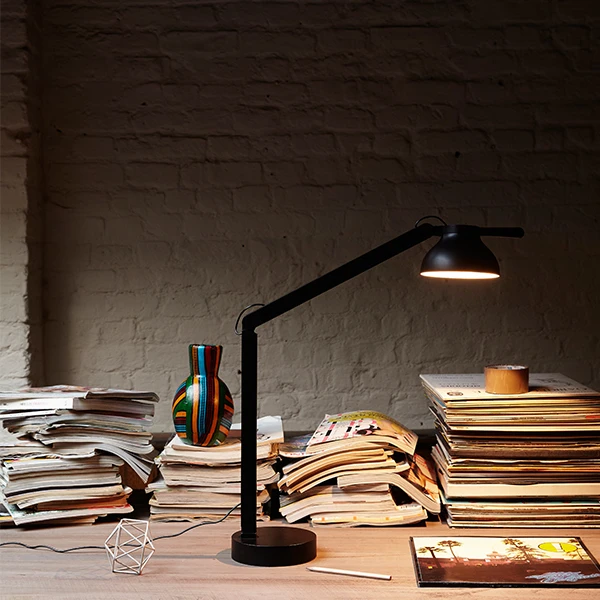 La lampe PC du designer Pierre Charpin pour HAY arbore un design raffiné et fonctionnel qui se démarquera dans un bureau ou une étude. Grâce aux ressorts à gaz dissimulés, les bras en aluminium et la tête en polycarbonate conservent leur position, quel que soit la manière dont ils sont orientés. Le variateur d’intensité tactile situé sur la tête dispose d’une fonction mémoire et éteint la lumière au bout de six heures.