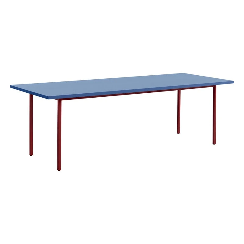 La table Two-Colour de HAY est un mélange jovial de couleurs éclatantes et de minimalisme strict. Créées par le duo de designers belges Muller Van Severen, les tables Two-Colour sont le fruit d’un mariage unique entre deux éléments très différents : un piétement en acier à la fois robuste et aéré, et un plateau de table fabriqué dans un nouveau matériau MDF certifié SFC, le Valchromat. L’aspect unique et texturé du Valchromat est légèrement visible à travers le vernis transparent, ce qui donne à cette table géométrique une touche organique.